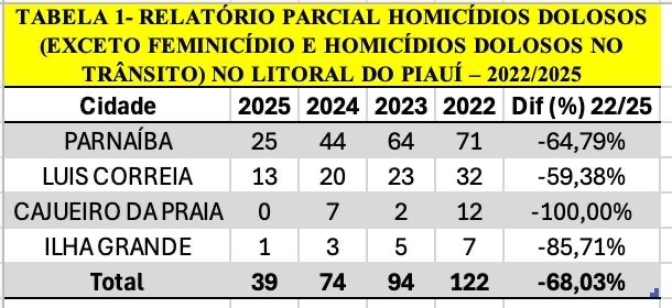 Os dados seguem critérios técnicos e padrões nacionais de validação, garantindo transparência e confiabilidade. A Secretaria ressalta que as ações de combate à criminalidade seguem sendo ampliadas, com foco na preservação de vidas e no fortalecimento da segurança da população do litoral piauiense.